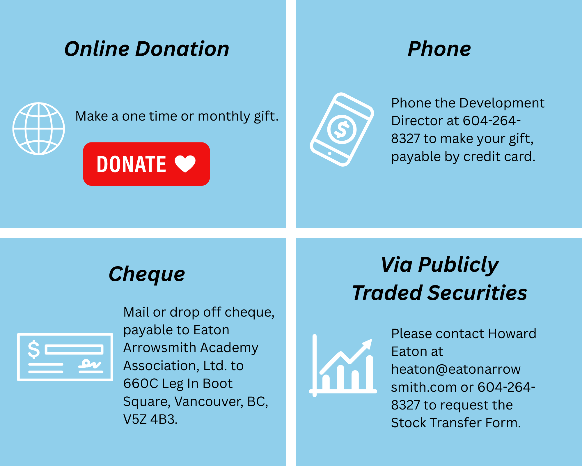 Eaton Arrowsmith Academy accepts online giving, cheques, pledges, matching gifts and stocks. Please contact Sandra Heusel, Director of Advancement, for information about pledges, matching gifts, or stock gifts.
